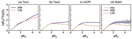 For Stath, earlier published SAXS data [] provided an Rg of nm; hence, Rg was 10% smaller in A99 and 27% smaller in C36. Since Rg determined from SAXS includes a hydration shell, it was expected that Rg calculated from simulations would be slightly smaller, although not to that extent. Since it is not straightforward which contrast to use for the hydration shell in the calculations of scattering curves for IDPs [], in Supplementary Figure S1 and Table S2, we compared the curves calculated using different contrasts of the hydration shell to the experimental curve for Stath. While the highest contrast used (0.03 e/Å3) yielded the best agreement with the scattering curve, it provided the worst agreement with the Kratky plot. Henriques et al. [] showed that the optimal contrast for IDPs was often between 0.01 e/Å3 and 0.02 e/Å3, although varying with both force field and protein. The optimal values for A99 and C36 were suggested to be around 0.0075 e/Å3 and 0.02 e/Å3, respectively. While the suggested optimal value gave reasonable agreement with the experimental form factor for A99, this was not the case for C36. For C36, all contrasts clearly showed larger compaction than the experimental Kratky plot.