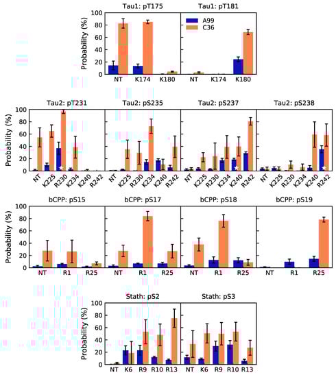 For Tau2, there is experimental evidence of the following salt bridges, detected by NMR experiments: pT231–R230, pS237–K240, and pS238–R242 []. pT231–R230 and pS238–R242 are indeed two of the most often occurring salt bridges in A99, while pS237–R242 is more common than pS237–K240. Several other salt bridges are also as frequently present as pS237–K240. In C36, pT231–R230 is the most occurring salt bridge, but both pS327–R242 and pS235–K234 are more probable than pS237–K240. Hence, while both force fields captured the experimentally established salt bridges, they also suggested other salt bridges to be present and some of them to be more common than the experimentally established ones.