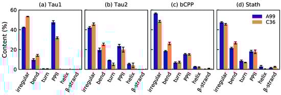 Average content of different types of the secondary structure in (a) Tau1, (b) Tau2, (c) bCPP, and (d) Stath simulated with Amber ff99SB-ILDN (A99) and CHARMM36m (C36). The legend applies to all panels. The helix includes the α- 310- and a negligible content of the π-helix, while the β-strand also includes β-bridge. Error bars correspond to errors calculated by block averaging.