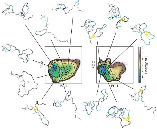 Energy landscapes and conformations in selected minima of Stath. (Left) A99; (right) C36. The energy landscapes are constructed using the first two components from principal component analysis, using the same basis set for both force fields, such that they are directly comparable. Contour lines are drawn for integer energy levels in the interval 1 ≤ RT ≤ 5, and the minimum of each basin is represented by a marker: ●: energy ≤ 1RT, ▲: ≤2RT, ✖: ≤3RT. In the conformations, the phosphorylated and positively charged residues are shown explicitly. Dashed black lines represent hydrogen bonds. The peptide conformations are color-coded according to the secondary structure determination in VMD, where silver is irregular (coil), cyan is turns, blue is the 310-helix, yellow is the β-sheet, and tan is the β-bridge. The N-terminus of each conformation is the leftmost/topmost end.