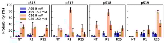 Probability of possible salt bridge interactions for the phosphorylated residues with the N-terminus (NT) and positively charged residues in bCPP, simulated with the two different force fields in the presence of 0 mM or 150 mM NaCl. Error bars corresponds to errors calculated by block averaging.