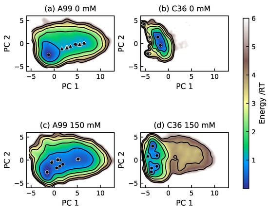 Energy landscapes of bCPP simulated with the two force fields Amber ff99SB-ILDN (A99) and CHARMM36m (C36) in the presence of 0 mM or 150 mM NaCl.