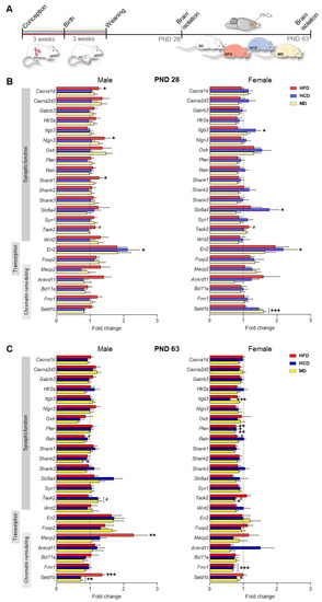 Bearing in mind the above information, this study aims to identify the influence of a maternal HFD, high-carbohydrate diet (rich in sucrose; HCD), and mixed diet (rich in fat and carbohydrate; MD) limited to pregnancy and lactation on the expression profile of ASD-related genes within the offspring prefrontal cortex (PFCx)—one of the brain structures related to the pathogenesis of ASD symptoms [17]. Next, in male and female offspring, we assessed, in a longitudinal study (from adolescence to early adulthood), the impact of the maternal HFD on both the changes in social and repetitive behaviors and the changes in ASD-related proteins and epigenetic mechanisms related to DNA methylation or microRNA (miRNA) expression.
