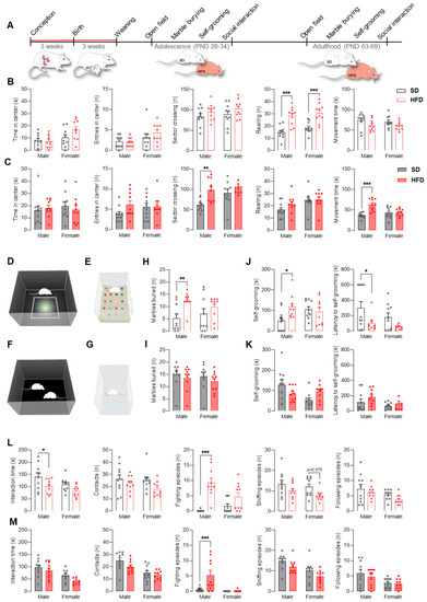 Given that ASD is a neurodevelopmental disorder that manifests early in life and often affects boys more than girls [18], for further research, we chose the HFD because it exhibited the greatest changes in the expression of the studied genes in male offspring 28 days after birth (Figure 1B). In four behavioral tests used in preclinical ASD studies, we assessed the behavior of adolescent and adult offspring exposed to a maternal HFD (Figure 2A,D–G).