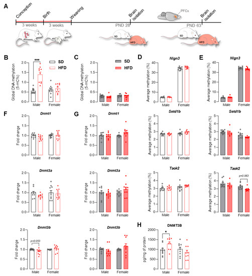 A maternal high-fat diet (HFD) during pregnancy and lactation increased global DNA methylation in the prefrontal cortex (PFCx) of adolescent male offspring. (A) Schematic of the epigenetic analysis. Rat dams were fed a standard diet (SD) or HFD during pregnancy and lactation. After weaning, offspring were changed to the SD and sacrificed at postnatal day (PND) 28 and PND 63 to evaluate epigenetic modifications in the PFCx. (B,C) Effect of the maternal HFD on global DNA methylation in the PFCx of male and female offspring at PND 28 (B, empty bars) and PND 63 (C, filled bars). PND 28: GM (main effect of diet: F(1, 36) = 28.98, p < 0.001), diet × sex interaction: F(1, 36) = 20.92, p < 0.001). (D,E) Effect of the maternal HFD on the promoter CpG island methylation of Nlgn3, Setd1b, and Taok2 in the PFCx of male and female offspring at PND 28 (D, empty bars) and PND 63 (E, filled bars). PND 63: Taok2 (main effect of diet: F(1, 36) = 5.18, p < 0.05), diet × sex interaction: F(1, 36) = 0.78, p = 0.38). (F,G) Effect of the maternal HFD on the Dnmt1, Dnmt3a and Dnmt3b mRNA levels in the PFCx of male and female offspring at PND 28 (F, empty bars) and PND 63 (G, filled bars). PND 28: Dnmt3b (main effect of diet: F(1, 36) = 1.02, p = 0.32), diet × sex interaction: F(1, 36) = 5.11, p < 0.05). (H) Effect of the maternal HFD on DNMT3B protein levels in the PFCx of male and female offspring at PND 28. DNMT3B (main effect of diet: F(1, 36) = 0.73, p = 0.40), diet × sex interaction: F(1, 36) = 6.60, p < 0.05). Data are expressed as the mean ± SEM. n = 10 male and 10 female rats/experimental group. Data were analyzed by two-way ANOVA and the Bonferroni multiple comparison post hoc test. * p < 0.05, *** p < 0.001 versus SD.