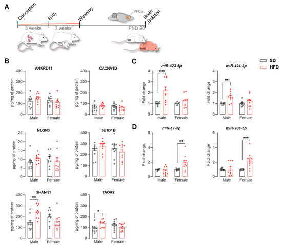 A maternal high-fat diet (HFD) during pregnancy and lactation increased SHANK1 and TAOK2 protein levels in the prefrontal cortex (PFCx) of adolescent male offspring. (A) Schematic of the protein analysis. Rat dams were fed a standard diet (SD) or HFD during pregnancy and lactation. After weaning, offspring were changed to an SD and sacrificed at postnatal day (PND) 28 to evaluate the changes in selected proteins and miRNA expression in the PFCx. (B) Effect of the maternal HFD on ANKRD11, CACNA1D, NLGN3, SETD1B, SHANK1, and TAOK2 protein levels in the PFCx of male and female offspring at PND 28. SHANK1 (main effect of diet: F(1, 36) = 1.80, p = 0.19), diet × sex interaction: F(1, 36) = 12.40, p < 0.01); TAOK2 (main effect of diet: F(1, 36) = 1.09, p = 0.30), diet × sex interaction: F(1, 36) = 8.24, p < 0.01). (C,D) Effect of the maternal HFD on the miR-423 and miR-494 (C) and miR-17 and miR-20a (D) levels in the PFCx of male and female offspring at PND 28. miR-423 (main effect of diet: F(1, 36) = 15.78, p < 0.001), diet × sex interaction: F(1, 36) = 7.28, p < 0.05); miR-494 (main effect of diet: F(1, 36) = 13.75, p < 0.001), diet × sex interaction: F(1, 36) = 2.72, p = 0.11); miR-17 (main effect of diet: F(1, 36) = 4.61, p < 0.05), diet × sex interaction: F(1, 36) = 9.47, p < 0.01); miR-20a (main effect of diet: F(1, 36) = 9.39, p < 0.01), diet × sex interaction: F(1, 36) = 6.61, p < 0.05).Data are expressed as the mean ± SEM. n = 10 male and 10 female rats/experimental group. Data were analyzed by two-way ANOVA and the Bonferroni multiple comparison post hoc test. * p < 0.05, ** p < 0.01, *** p < 0.001 versus SD.