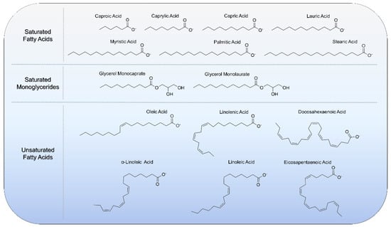 Fatty acids and monoglycerides are single-chain lipid amphiphiles that possess a hydrocarbon chain and a hydrophilic headgroup, and can intercalate into phospholipid membranes to trigger membrane disruptions such as solubilization, pore formation, or shape remodeling depending on the context [12]. Such membrane-modulating activities have proven useful for exploring fatty acids and monoglycerides, especially those with 6- to 12-carbon long, saturated chains, as anti-infective agents to inhibit membrane-enveloped viruses and bacteria [13,14], along with longer-chain, polyunsaturated fatty acids for cardiovascular and immune health [15]. An overview of the molecular structures of biologically active fatty acids and monoglycerides is presented in Figure 1 and there are various classes depending on the headgroup properties, chain length, and prevalence and number of double bonds in the chain.