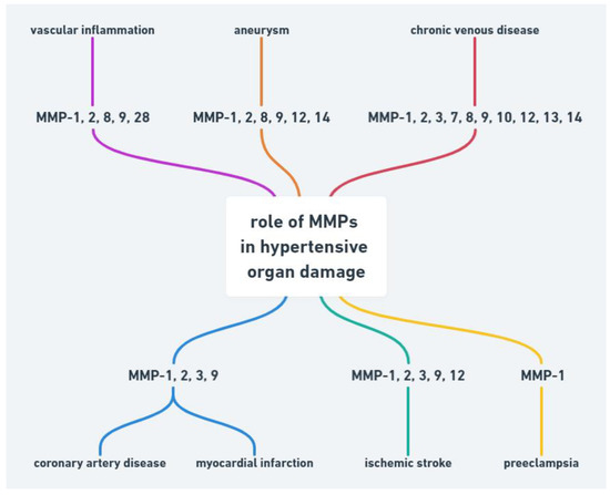 Abnormality in MMPs function may be also associated with other cardiovascular diseases such as hypertension, atherosclerosis, aneurysm, chronic venous disease and preeclampsia (Figure 1).