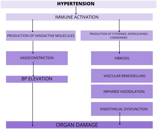 It is now widely acknowledged that low-grade or persistent inflammation is a key player in the development and maintenance of AH. The compounds of the immune system are managed to produce vasoactive molecules, such as Ang II, endothelin-1 or prostaglandins. All of them are known as the hypertensive mediators and TOD mediators [22]. These data showed that monocytes and macrophages enhance vasoconstriction and sodium retention. Furthermore, antigen-presenting cells -the dendritic cells (DCs) and B lymphocytes may stimulate the rise of BP by modulating the T cell function. Furthermore, the DCs produce mediators like IL-1β and IL-6, which could modify BP independently of T cells [23,24]. On the contrary, Il-10 has a protective role on renal damage by reducing albuminuria. Furthermore, Il-10 inhibits endothelial dysfunction and superoxide production. These findings raise the possibility that disrupting inflammatory functions could restrain target organ damage, accruing from hypertension through blood pressure-independent mechanisms. This study aimed that after administration of Ang II, the mice with MR deficiency in T-cell were associated with lower BP, both systolic and diastolic. Moreover, there was decreased renal and vascular dysfunction. Therefore, the mineralocorticoid receptor (MR) antagonists are used in AH treatment for many years, the blockage of MR in T-cells could be a novel target in antihypertensive therapies [25]. In the vasculature, the immune cells are accumulating in the perivascular fat and by producing the various molecules (e.g., cytokines, chemokines, MMPs, ROS); they leading to the BP elevation, impairing vasodilation, stimulating collagen synthesis and degrading the elastic lamina, as well as increasing vascular stiffness [26]. Moreover, there are studies highlighting that, due to hypertension, there is the accumulation of activated Th17 cells in the cardiac wall. The Th17 cells in the heart lead to remodeling and fibrosis and therefore, to cardiac hypertrophy, arrhythmia or heart failure. The Th17 cells also produce Il-17-, the proinflammatory cytokine, especially in high salt conditions [27]. The Il-17 increases the BP pressure through inhibiting endothelial nitric oxide production, increasing ROS formation and promoting fibrosis. Interestingly, if the level of Il-17 is lowered, it aids in the BP’s normalization and reduces the inflammatory response in the myocardial tissue [28]. Furthermore, Il-17 has a major role in aortic stiffening, because of the increased synthesis and deposition of collagen within the aortic wall [29]. Moreover, the Il-17 is also the mediator of renal injury. This cytokine is enhancing renal sodium retention and glomerular injury. The therapies targeting Il-17 might be an effective treatment for hypertension and its associated TOD [27]. Furthermore, these results discover that the Il-11 expression in adventitial fibroblasts is stimulating the adventitial remodeling and vascular fibrosis. The knockout of Krüppel-like factor-15 expression, which promotes the Il-11 production, might be another target for decreasing the vascular remodeling in AH [30]. It is important to note that the accumulation of immune cells within the tissue leads to local production of hypertensive mediators, such as Ang II, and increase the local levels of hypertensive stimuli within the kidneys, vasculature or nervous system [22]. Lately, extensive evidence demonstrates the role of brain perivascular macrophages (PVMs) in the development of AH. The pro-inflammatory mediators, such as IL-1β, increase PGE2 expression within PVMs, which results in enhanced sympathetic activation and BP elevation [31]. Furthermore, the pericytes and the astrocytes in the blood–brain barrier (BBB) could also be affected by systemic inflammation. As a consequence, the impairment of cells in the BBB leads to increased level of immune cells within the brain and, therefore, to the neuronal overexpression of PVMs [32]. Cytokines that are particularly relevant to hypertension are produced by T cells, B cells, mast cells, macrophages and DCs. In these series of studies, the authors discussed the role of chemokines in the pathophysiology of hypertension. They indicate that tissue expression of CCL2 and CCL5 is raised in hypertension. Circulating levels of CCL2 are upregulated in hypertensive patients and correspond with the degree of hypertension-associated organ damage. Moreover, the CCL2/CCR2 axis consistently exacerbates hypertensive tissue injury and inflammation. Although CCL5 expression increases in the kidney during hypertension, its effects on renal inflammation and injury seem to be protective [33]. There are studies that indicate the role of the CXC cytokines family in hypertension. These molecules decrease vascular dysfunction and remodeling, as well as reducing the progress of fibrosis. However, these data require further study.