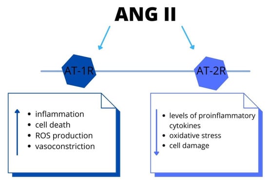 Ang II (angiotensin II), a main pro-hypertensive hormone, mediates target organ disorder, by activation of immune cells [40]. Moreover, the leukocyte ligand-P-selectin glycoprotein ligand-1 (Psgl-1) manages endothelial function and mediates the IL-17 production in order to Ang II. Due to Psgl-1, there are increased levels of inflammatory biomarkers. The accumulation of immune cells leads to endothelial dysfunction and, thus, blood pressure elevation. Therapeutic targeting of Psgl-1 or downstream IL-17 could be a target in certain anti-hypertensive therapy [41]. Furthermore, Ang II causes endothelial dysfunction due to vasomotor alteration and migration and attachment of leukocytes [42]. These data showed the link between alteration in the angiotensinogen gene and hypertension. The authors demonstrated that Ang II acts not only via the AT-1 receptor but there is also the intrarenal synthesis of Ang II. Moreover, intrarenal Ang II stimulates the angiotensinogen mRNA levels. Thus, there is a positive feedback mechanism, by which the production of angiotensinogen mRNA increases further the production of intrarenal Ang II. The elevation of intrarenal Ang II results in renal and vascular injury, triggering the progression of AH [43]. It is essential to indicate that also the central nervous system (CNS) has a part in AH pathogenesis. There is a secretion of Ang II in neuronal tissue, which acts locally on raising the arterial blood pressure, as well as activating the immune cell within the CNS. However, the complete understanding of these mechanisms is still unknown and further research to acknowledge this is required [44]. In addition, the RAAS has a major role in the pathophysiology of traumatic brain damage (TBD), via AT-1R and AT-2R signaling. The AT-1R mediates inflammation, cell death, oxidative stress and vasoconstriction in the brain. On the contrary, the AT-2R decreases levels of proinflammatory cytokines, oxidative stress and improves cell survival. This could be a novel target for treating TBD [45]. Furthermore, Ang II stimulate production of proinflammatory molecules and increase ROS via AT-1R pathway [45] (Figure 3). Therefore, this signaling is associated with aggravated risk of several diseases, including stroke, retinopathy and coronary artery disease. Within the brain, the Ang II regulates the cerebral blood flow and neuroinflammation [46]. In the cardiovascular system, the Ang II leads to vasoconstriction, sodium–water retention, inflammation, hypertrophy and fibrosis. Therefore, it is associated with the development or progression of cardiovascular and renal disease [47]. In addition, according to these data, the reduced modulation of RAAS activity in response to sodium restriction and increased aldosterone on a high sodium diet might predisposed hypertensive patients to abnormal cardiac remodeling [48].