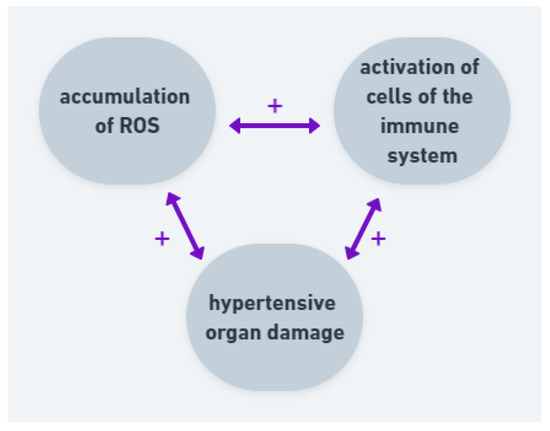 Correlation and positive feedback between ROS, immune cells and hypertensive organ damage. Accumulation of ROS leads to activation of cells of the immune system and both factors lead to hypertensive organ damage. The organ damage intensifies ROS production and activates immune system.