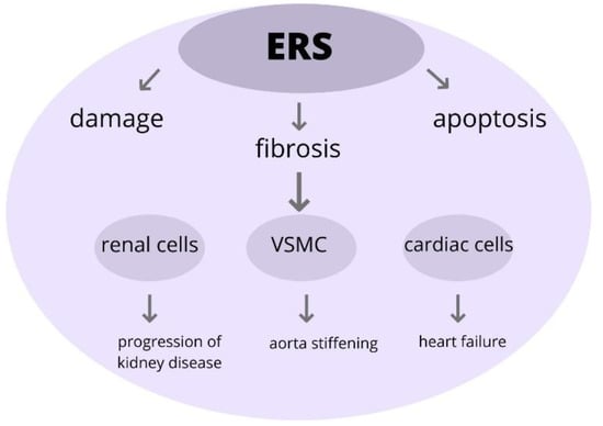 This study investigated the role of ERS within the aorta. The induction of ERS leads to changes in the vascular smooth muscle cells (VSMC), as well as to its apoptosis and fibrosis. Moreover, there is developing data that the ERS response is associated with the rising BP in rats. As a consequence of ERS, the aorta stiffening and endothelial dysfunction occur; therefore, there is a greater risk of heart failure development [68]. Increasing evidence indicates that ERS and various compounds of UPR participate during cardiac remodeling and fibrosis [69]. Furthermore, these findings suggest that cardiac ERS is induced via an Ang II type 1 receptor-dependent pathway. Accelerated activation of ERS leads to cardiac myocyte apoptosis and, as a result, to the progression of heart failure [70].