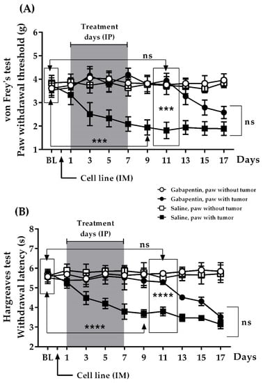 2.4. Effect of Preventive Administration of Gabapentin upon Nociceptive Changes Produced by Tumor Progression