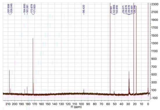 13C NMR spectrum of sodium pyruvate-d3 in D2O with 1% (w/w) 3-(trimethylsilyl)-1-propanesulfonic acid, sodium salt (DSS) (reference)(x-axis: chemical shift (ppm); y-axis: intensity of signal). Peaks at 181.261 and 96.420 ppm indicate presence of pyruvate hydrate. Peaks at 181.9, 184.9, 206.0, and 50.0 ppm indicate possible presence of parapyruvate (dimer). Peaks between 29.1 and 28.2 ppm indicate Cd3 signal of sodium pyruvate-d3.