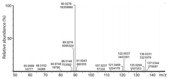 High resolution mass spectrum of the deuterated sodium pyruvate: m/z calculated for C3D3O3– [M–H]–: 90.03; found: 90.03; calculated for C3D2HO3– [M–H]–: 89.02; found: 89.02; calculated for C3DH2O3– [M–H]–: 88.02; found: 88.01.