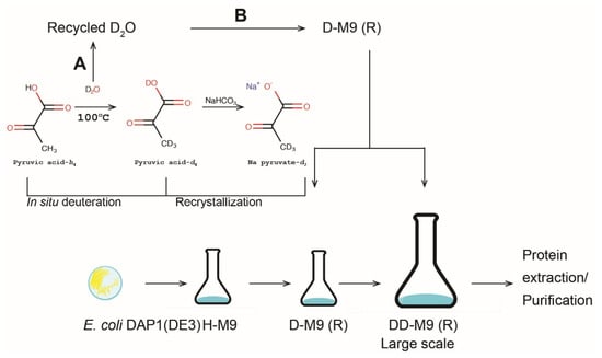 Framework of production of sodium pyruvate-d3, and deuteration of recombinant proteins. Deuterated pyruvic acid is produced by boiling pyruvic acid in D2O. This solution can be immediately used as base for growth medium or sodium pyruvate-d3 can be recrystallized. The heavy water (D2O) used in pyruvate deuteration could be used for subsequent labelling procedures (A) or used as solvent for growth media (B).