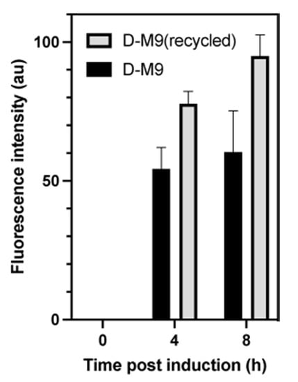 Protein production using E. coli DAP1(DE3). Absolute fluorescence intensities (arbitrary units) in cells harvested at different time points after inducing expression of the gene encoding sfGFP. E. coli DAP1(DE3) was grown at 37 °C in D-M9 and D-M9 prepared with recycled D2O. Protein expression was induced at an OD600 of ~1. Each histogram represents three biological replicates. Error bars represents the standard error of the mean.