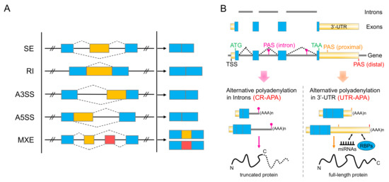 Alternative splicing (AS) and alternative polyadenylation (APA). (A) Schematic representation of the five major types of alternative splicing in eukaryotes: Skipped Exon (SE), Retained Intron (RI), Alternative 3 Splice Site (A3SS), Alternative 5 Splice Site (A5SS), and Mutually Exclusive Exon (MXE). Light blue boxes represent the constitutive exons, whereas light yellow and pink exons represent the spliced ones. (B) Two types of alternative polyadenylation, i.e., coding region alternative polyadenylation (CR-APA) and 3-UTR alternative polyadenylation (UTR-APA), and their impact on the functional proteome. PAS: polyadenylation signal; TSS: transcription start site; RBP: RNA-binding protein.