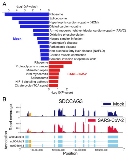 (A) KEGG pathways enriched by alternative splicing events. The blue and red bar charts show the pathways enriched by the splicing events in mock-treated cells and SARS-CoV-2 infected cells, respectively. (B) A plot for the SDCCAG3 AS event. The spliced exon is highlighted in orange. The first two subplots show the read coverage of the gene in both groups, whereas the bottom subplot denotes the gene annotation with exon information. The x-axis and y-axis of the plot represent the position of the specific gene and read coverage of that sample, respectively. To show the differential splicing event, the altered exon is highlighted in orange to provide a clear insight into the phenomenon.
