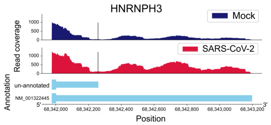 Our pipeline, APA-Scan [27], identified 144 unannotated UTR-APA events, which were reported using the Chi-squared hypothesis test on A549 cells. A total of 137 UTR-APA events were identified in mock-treated cells, while only 7 UTR-APA events were found in SARS-CoV-2 infected cells, indicating that UTR-APA events were suppressed in SARS-CoV-2 infected cells. Figure 3 shows a UTR-APA event for the gene HNRNPH3 generated by APA-Scan. In Table 4, the top 10 UTR-APA events are reported by the p-value in the ascending order. The p-values indicate the significance of the UTR-APA event between mock versus SARS-CoV-2 infected cells. The ratio difference in the last column is calculated by taking the average read coverage ratios of the two groups. A positive ratio difference indicates an increase in the UTR-APA event in mock-treated cells. Based on the results reported in Table 4, all the top 10 events were identified from the mock-treated cells, thereby reinforcing that SARS-CoV-2 infections suppress the usage of the proximal polyadenylation signal in the 3-end processing of mRNAs. The literature survey shows that three genes (ANXA2, CAV1, and TMEM97) with the UTR-APA events related to SARS-CoV-2 pathogenesis and prognosis (Table 3). For example, TMEM97 has been recently shown to interact with SARS-CoV-2 viral proteins [20].