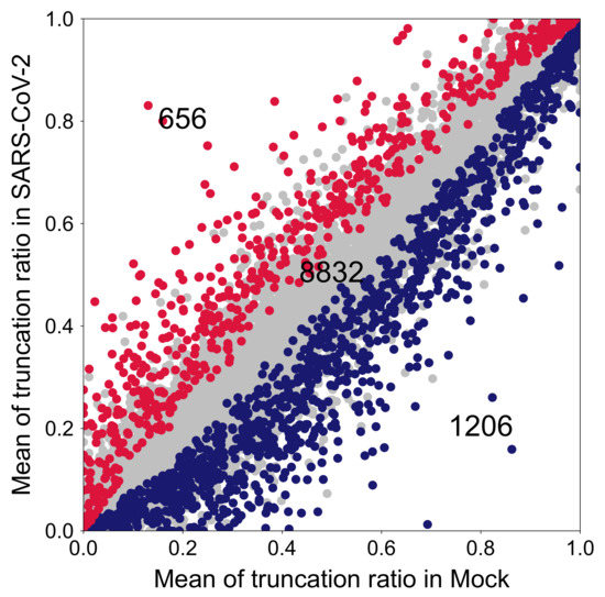 In the CR-APA analysis, both the hg38 RefSeq annotation [28] and the UCSC annotation [29] were applied to report the list of CR-APA events between mock-treated versus SARS-CoV-2 infected cells. We identified significant CR-APA events by measuring the CR-truncation ratio (Equation (4)). We found an increase of 1206 CR-APA events in mock-treated cells and an enrichment of 656 CR-APA events in SARS-CoV-2 infected cells, indicating that CR-APA events are more frequent in mock-treated cells. The bipartite expression patterns of CR-APA in Figure 4 revealed an enrichment of specific truncated mRNAs in both mock and SARS-CoV-2 infected cells, indicating that reprogramming of the transcriptome and consequent changes in the proteome diversity would occur upon SARS-CoV-2 infection.