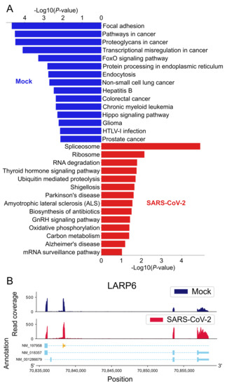(A) KEGG pathways enriched by CR-APA events. The blue and red bar charts show the pathways enriched by the APA events in mock-treated cells and SARS-CoV-2 infected cells, respectively. (B) One example of a gene (LARP6) shows an alternative polyadenylation event in the coding region. The truncated coding exon is highlighted in orange.