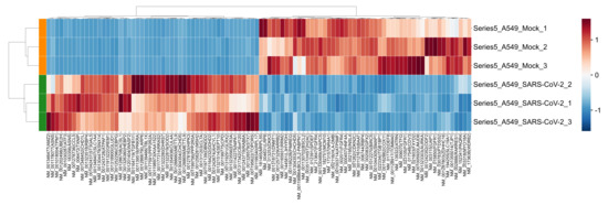In differential expression analysis, 991 genes and 1443 transcripts show higher expression in mock-treated cells, whereas 717 genes and 933 transcripts show higher expression in SARS-CoV-2 infected cells. These differentially expressed genes and transcripts can be served as molecular signatures for COVID-19 outcome prediction. The top 100 differentially expressed transcripts and genes were selected for bi-clustering analysis. The z-score transformation was applied to the expression value for each entry in the heatmap. From the results, we can see that the six samples are precisely clustered into two groups (Figure 6 and Figure S1 in the Supplementary Materials).