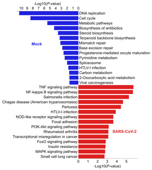 Differentially expressed transcripts enriched KEGG pathways. The blue and red bar charts show the pathways enriched by the up-regulated and down-regulated transcripts in mock-treated samples over SARS-CoV-2 infected samples, respectively.