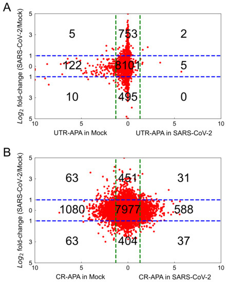 The relationship between differential gene expression and the UTR-APA event was tested based on the APA events identified in Section 2.3.1 and the differentially expressed genes identified in Section 2.4. We combined the analyses of UTR-APA and differential gene expression, and the results are shown in Figure 8A. Each gene was plotted by fold changes in the differential gene expression (y-axis) and the significance of UTR-APA events (x-axis). The left three sections and the right three sections in Figure 8A show the 3-UTR-truncated genes in mock-treated cells and SARS-CoV-2 infected cells, respectively. The top three sections and the bottom three sections represent the up-regulated and down-regulated genes in SARS-CoV-2 infected cells over mock treated cells, respectively. From the plot, we can see that a significant portion (>88%) of the genes showing UTR-APA events are not differentially expressed, indicating no strong correlation between the differential gene expression and the UTR-APA events in the SARS-CoV-2 infected cells. Similarly, more than 90% of the genes showing CR-APA events are not differentially expressed (Figure 8B). Therefore, the profiling of APA-based molecular signatures could provide additional predictive power and potentially lead to the findings of new target pathways for SARS-CoV-2 related translational research.