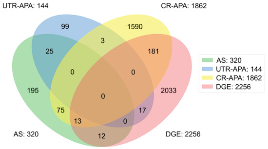 To further investigate the relationship among all transcript variants identified in this study, a four-set Venn diagram is generated to illustrate the intersections of differentially expressed genes (DEG) and the genes with post-transcriptional regulation events (Figure 9). Both RefSeq and UCSC annotations were applied in the data analysis to make the experimental results comparable. The total number of events generated from alternative splicing, UTR-APA, CR-APA, and differentially expressed genes are 320, 144, 1862, and 2256, respectively. None of the genes were shown in all four categories. Though 2256 genes were detected as differentially expressed genes, only 25 of them have alternative splicing events and 17 of them have UTR-APA events. In the case of an alternative splicing event in a gene showing CR-APA, it has a higher chance of being considered as a CR-APA gene. Based on these observations, we found that 27.5% of genes with AS events show CR-APA. Overall, the results further confirm that post-transcriptional regulation profiles and differential gene expressions profiles provide distinctive molecular signatures for COVID-19 studies. In addition, the three different types of post-transcriptional regulation events barely overlap.