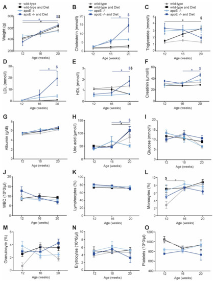 Blood analysis of apoE−/− rats at different time points under feeding high-fat diet (A–O). Indicated parameters and cell components were determined after 4 weeks (age 12 weeks), 8 weeks (age 16 weeks) and 12 weeks (age 20 weeks), respectively (n = 5–15), under normal diet (bright blue for apoE−/− and grey for wild-type rats) or high-fat diet (dark blue for apoE−/− and black for wild-type rats). * p < 0.05 vs. earlier time points, $ p < 0.05 high-fat vs. normal diet (in black for wild-type and in blue for apoE−/− rats).