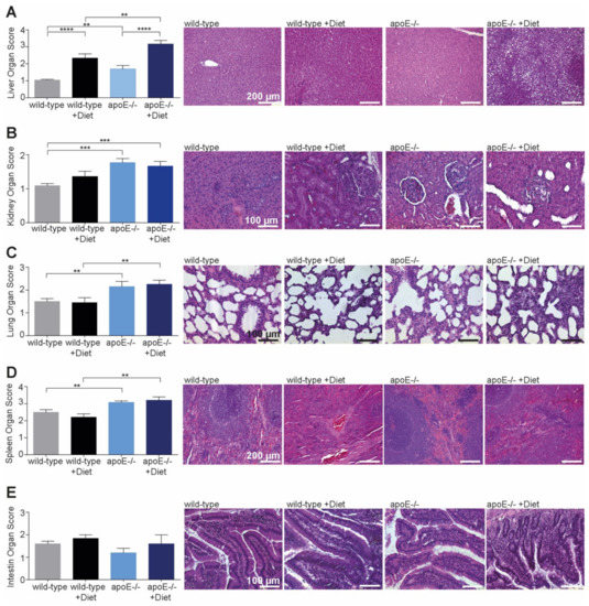 Changes in organ morphology of apoE−/− rats after feeding high-fat diet (A–E). Twelve weeks (age 20 weeks) after feeding normal or high-fat diet, apoE−/− rats showed pathological changes in almost all organs compared with wild-type rats. While pathological changes in kidney, lung, and spleen were not related to diet, the liver was dramatically affected by high-fat diet, especially in apoE−/−. ** p < 0.0, *** p < 0.001, **** p < 0.0001, n = 5–15, scale bar is indicated in the first image of each group.