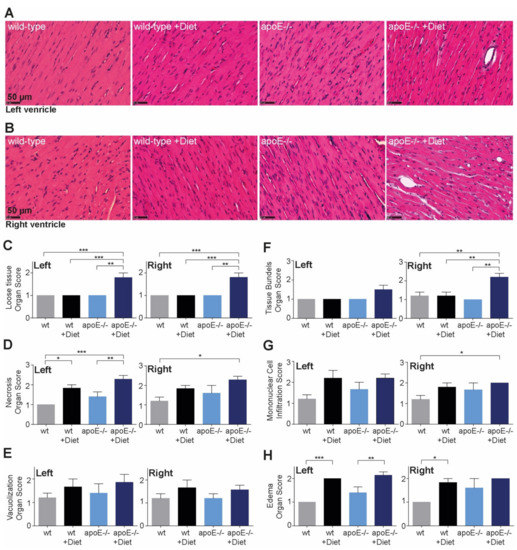 Heart tissue was analyzed separately in the left (Figure 3A) and right ventricle (Figure 3B). Both ventricles presented loose interstitial tissue (Figure 3C) in apoE−/− rats fed the high-fat diet, suggesting defects in the extracellular matrix in preserving the structural integrity. Similarly, we detected increased areas of necrosis (Figure 3D) in both ventricles in apoE−/− rats after feeding the high-fat diet, suggesting more susceptible myocardium in this group. No differences in the vacuolization of the cells were observed (Figure 3E). Further, the right myocardium of apoE−/− rats fed the high-fat diet showed increased bundles of thin tissue (Figure 3F) and mononuclear cell infiltration (Figure 3G), while the left myocardium showed more prominent edema (Figure 3H).