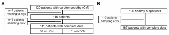 Study design. Patients with cardiomyopathy (A) and the healthy volunteers (B) recruited for the current study.
