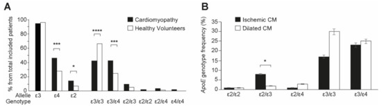 Comparing the frequency of different genotypes inside the CM patients group, there were no significant differences between the patients with ICM or DCM (Table 3). The presence of the ε2/ε3 genotype was more frequent in the group of patients with ICM (p = 0.019) (Table 3, Figure 6B). However, due to the small number of patients presented these alleles (eight patients for ICM and two patients for DCM) this result would need confirmation with higher patient numbers.