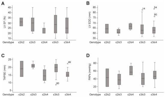 There were no significant differences between the functional parameters between different genotypes; however, the ε2/ε4 genotype showed a non-significant trend towards reduced LVEF (Figure 7A), higher LVEDD (Figure 7B), as indicators for left ventricular dysfunction, and decreased TAPSE (Figure 7C) and an increase in systolic pulmonary artery pressure (Figure 7D) as indicators for right ventricular dysfunction.