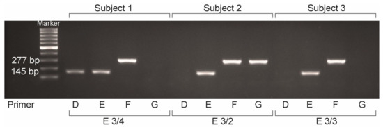 The primer combination of every genotype. The E3/3 genotype yielding a 145 base pair product with primer E, indicating the presence of Cys 112, and a 277 base pair product with primer F indicating the presence of Arg 158. The heterozygote E3/4 produces appropriately sized products with primers E and F identifying the E3 allele, but also produces a 145 base pair product with primer D indicating Arg 112. Homozygous E4/4 subjects only react with primers D and F, marking the presence of Arg 112 and Arg 158, while E2/2 homozygotes only react with primers E and G, indicating Cys 112 and Cys 158.