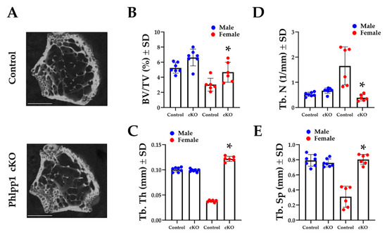 Conditional deletion of Phlpp1 increases bone mass of female mice. Phlpp1 cKOLysM mice and their littermate controls were aged to 12 weeks and micro-CT was performed at the distal femur. (A) Representative images from female mice. Scale bar is 1 mm. (B) Bone volume per total volume (BV/TV), * p < 0.05. (C) Trabecular thickness (Tb. Th), * p < 0.05. (D) Trabecular number (Tb. N), * p < 0.05. (E) Trabecular spacing (Tb. Sp), * p < 0.05.