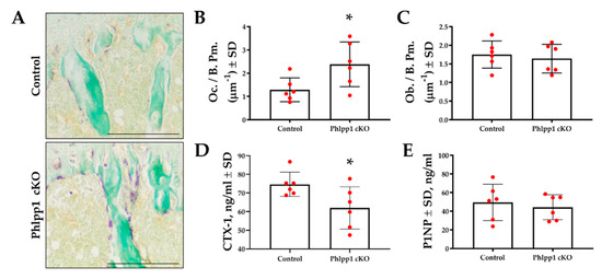Bone histomorphometry was performed using tibiae of 12-week-old Phlpp1 cKOLysM mice and their control littermates to assess osteoclast and osteoblast numbers. TRAP-Fast Green staining was performed (Figure 2A,B) and demonstrated increased osteoclast number per bone perimeter (Figure 2A,B) within the proximal tibiae of Phlpp1 cKOLysM females. No changes in osteoblasts per bone perimeter were observed (Figure 2C). Serum ELISAs also demonstrated a 33% decrease in CTX-1 (Figure 2D), but no change in P1NP levels (Figure 2E).
