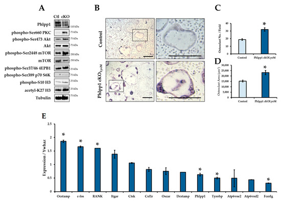 Increased osteoclasts per bone surface were evident within 12-week-old Phlpp1 cKOLysM females. To further explore potential effects on osteoclast differentiation, ex vivo osteoclastogenesis assays were performed. Bone marrow macrophages were collected from Phlpp1 cKOLysM females and their sex-matched littermate controls and cultured in the presence of RANKL and M-CSF as previously described [13,19,20]. Diminished expression of Phlpp1 was confirmed of ex vivo osteoclasts derived from Phlpp1 cKOLysM mice (Figure 3A,E). Moreover, enhanced phosphorylation of Phlpp1 substrates was also observed (Figure 3A). Increased osteoclast number (59%) and area (66%) was also noted of Phlpp1 cKOLysM cultures (Figure 3B–D). This was accompanied by modest increases in OCstamp, c-fos and RANK expression (Figure 3E), but expression of Tyrobp and Fcerg was diminished (Figure 3E). No significant change in Itgar, Ctsk, Csf1r, Oscar, DCstamp, or Atp6voe2 was observed (Figure 3E).