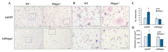 Phlpp1 Represses ex vivo Osteoclastogenesis. Osteoclasts were generated from bone marrow macrophages collected from 6–8-week-old Phlpp1−/− females or their sex-matched WT controls. Cultures were infected with each indicated adenovirus (MOI = 10) on day 0 and samples were collected on day 4. (A,B) TRAP staining of Phlpp1−/− or WT cultures. Insets in panel (A) denote locations of higher power images shown in (B). (C) Number of osteoclasts and (D) average osteoclast area per field were determined, *: p < 0.05 as compared to WT, AdGFP samples. Scale bars are 100 microns.