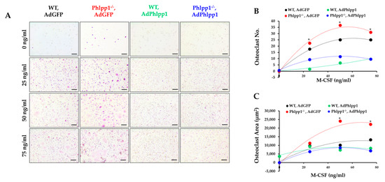 Bone marrow macrophages were collected from Phlpp1 cKOLysM mice or Phlpp1−/− mice and their control littermates as previously described [40]. Cells were cultured in phenol red-free α-MEM overnight in the presence of 35 ng/mL rM-CSF (#410-ML, R&D Systems, Minneapolis, MN, USA). Non-adherent cells were collected and cultured with 90 ng/mL rRANKL (#315-11, PreproTech, Rocky Hill, NJ, USA) and 35 ng/mL M-CSF at a density of 0.4x106 cells/cm2 [40] and infected with each indicated adenovirus (MOI = 10). For dose–response assays using Phlpp1−/− cells, cells were exposed to increasing M-CSF concentrations and infected with adenoviral (Ad) GFP or AdPhlpp1 at an MOI of 10 as previously described [41,42]. On day 4, cells were either fixed or lysed on ice in a buffered SDS (0.1% glycerol, 0.01% SDS, 0.1 m Tris, pH 6.8) for further analyses. For enumeration of osteoclast number and size, cells were TRAP (#387A-1KT, Sigma-Aldrich, St. Louis, MO, USA) and DAPI (#H-1200-10, Vector Biolabs) stained. The number and size of TRAP+ cells with 3 or more nuclei was determined as previously described [13]. All experiments were repeated three times with independent biological replicates.