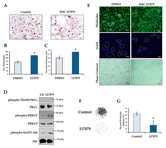 Since conditional deletion of Phlpp1 enhanced bone mass and reduced serum CTX-1 levels in vivo, we determined if small molecule-mediated inhibition of Phlpp isoforms limited bone resorption in vitro. Osteoclasts were generated from 4–6-week-old female C57Bl/6 mice and cultured in the presence of 5 μM NSC 117079 on day 0. Phlpp inhibition enhanced osteoclast numbers and size (Figure 6A–C). These observations were accompanied by enhanced phosphorylation of Phlpp substrates, including Akt, ERK1/2 and PKCζ (Figure 6D and Figure S1). In contrast, the actin cytoskeleton of osteoclasts was disrupted as compared to control treated cells (Figure 6E). Moreover, when cells were cultured on bovine bone slices for 10 days, Phlpp inhibition reduced bone resorption in vitro (Figure 6F,G).