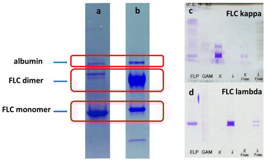 Representative examples of electrophoretic patterns of urine samples used in the study (a,b). As seen, the main component of urine samples were monomers or dimers of the immunoglobulin light chains. They were proved to be kappa (c) or lambda (d) free light chains—based on the immunofixation.