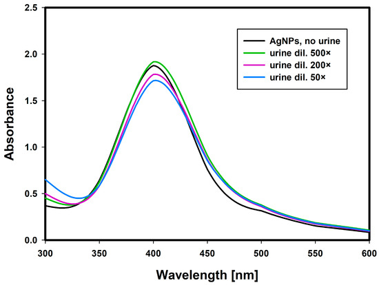 UV/Vis spectra of silver nanoparticle solutions after addition of different volumes of urine samples from healthy donors—control study, representative example. The dilutions of urine samples were: 50×, 200×, 500× —the same as in the test with FLC-containing samples.