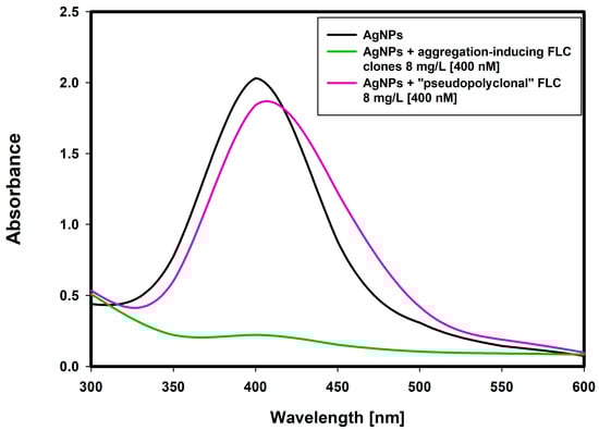 UV/Vis spectrum changes that occur after coating silver nanoparticles with free light chains (8 mg/L, (400 nM)): aggregation-inducing free light chains clone (green line) and “pseudopolyclonal” free light chains (violet line). The “pseudopolyclonal” free light chains mixture does not cause aggregation of nanoparticles.