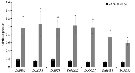 2.2. Comparative Analysis of Differentially Expressed Genes (DEGs) during Axillary Bud Formation at 25 °C and 35 °C Conditions