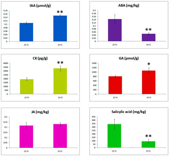 2.4. The Expression of Hormone-Related Core Genes Affected by High Temperature