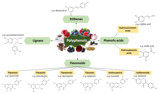 Polyphenols are classified based on their structure in several groups. Figure 2 represents the groups and subgroups of polyphenols using a representative compound for each group, showing the characteristic chemical structure and some relevant dietary sources [25].