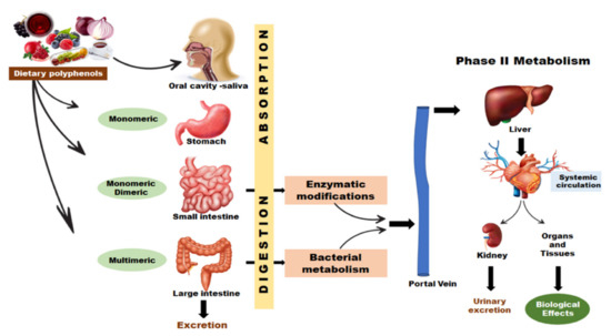When consumed, polyphenolic substances undergo important degradation processes due to the gastrointestinal transit, where the compounds need to be released from the food matrix in order to be absorbable. The penetration through the intestinal barrier represents a critical point due to the low amounts of bioactive compounds released into the bloodstream. The unaffected compounds undergo complex metabolism, both in the gut and the liver [157]. Figure 3 illustrates a simplified scheme that represents the polyphenols’ track when ingested.